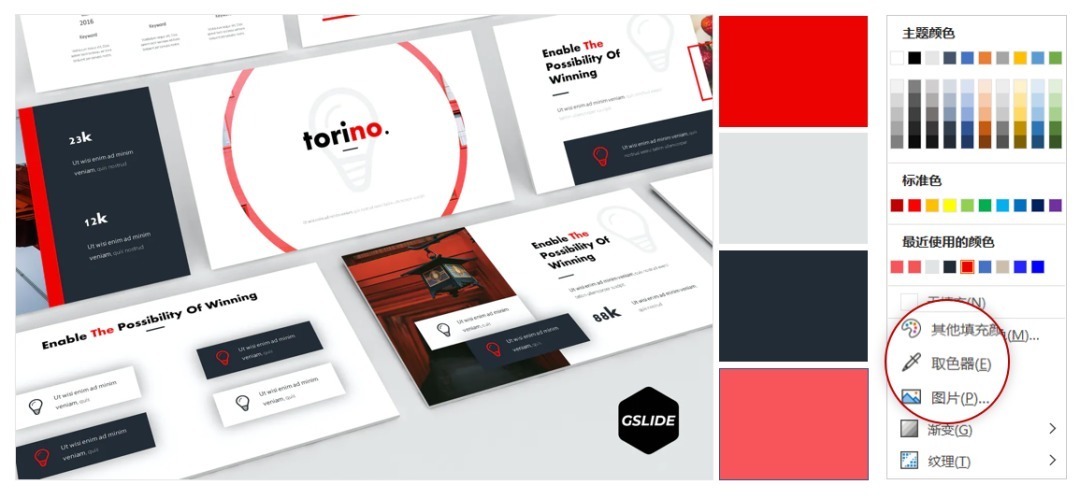 技巧2:吸色用色同时,为了方便大家的日常使用,在我们设置图形或者文本颜色的时候,推荐大家多多使用系统自带的取色器。